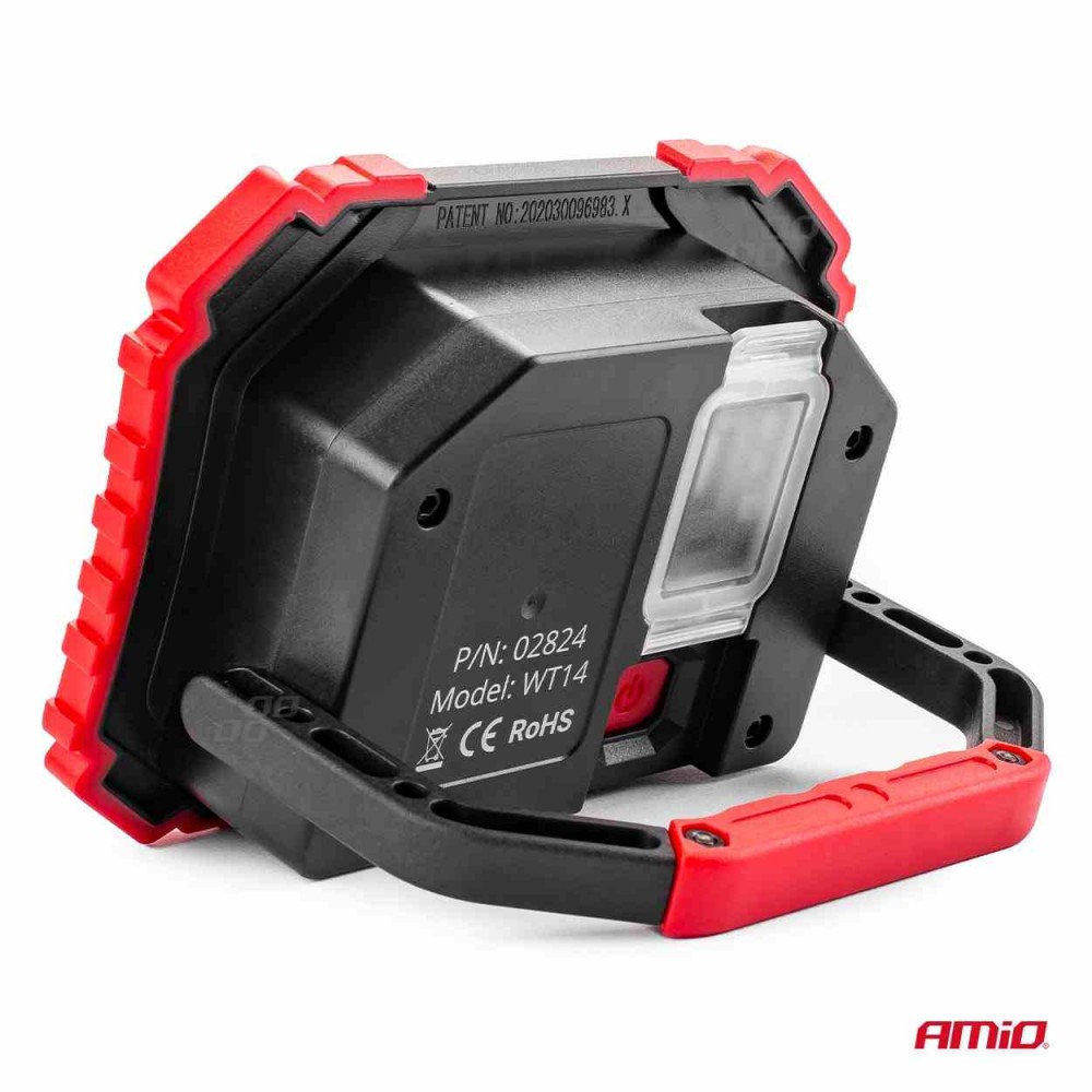 Επαναφορτιζόμενος προβολέας LED της AMiO, κατάλληλος για συνεργεία ή για χρήση σε χώρους όπως η αποθήκη. Tροφοδοτείται μέσω της θύρας USB.