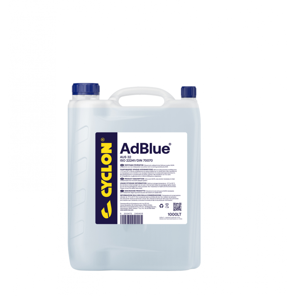 Το Cyclon AdBlue είναι ένα έτοιμο προς χρήση υγρό καυσαερίων ντίζελ (AUS32) που περιέχει 32,5% ουρία σε υπερκάθαρο νερό, σύμφωνα με τις προδιαγραφές ISO 22241 & DIN 70070.