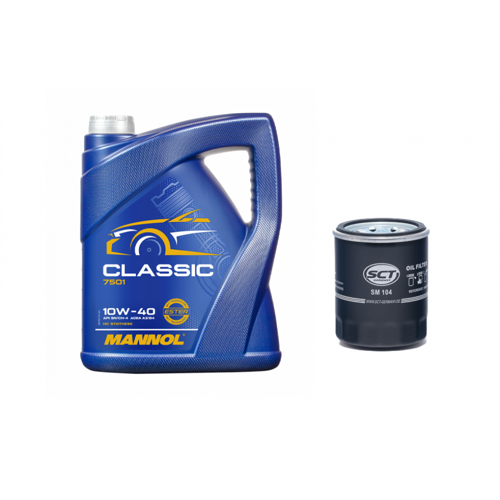 Συνδυάζει το αξιόπιστο ημισυνθετικό Mannol Classic 10W-40 (4 L) με φίλτρο λαδιού SCT (OE-equivalent), για καθαρή λίπανση και σταθερή απόδοση στην καθημερινή χρήση.