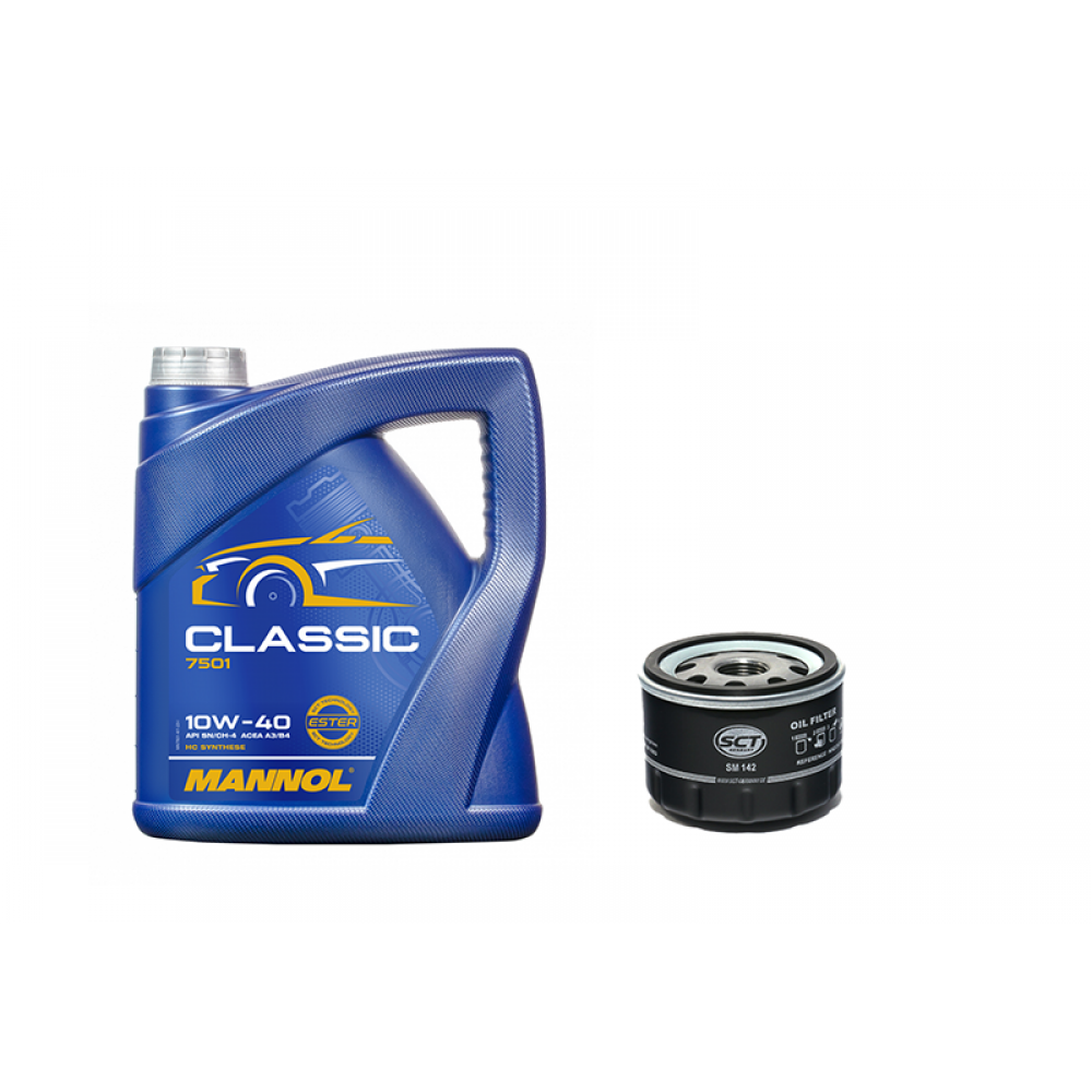 Συνδυάζει το αξιόπιστο Mannol Classic 10W-40 7501 (4 L) με το φίλτρο λαδιού SCT SM142 (spin-on, M20×1.5) για καθαρή λίπανση και σταθερή απόδοση σε καθημερινή χρήση.